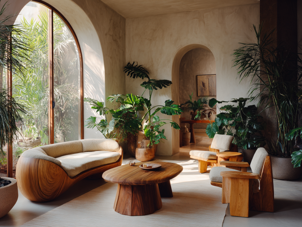 Sculptural tables serve as functional art. Coffee tables with organic pedestal bases, dining tables with live edges, and side tables featuring asymmetrical tops all celebrate natural forms. Materials like carved wood, smooth stone, or molded plywood showcase both craftsmanship and nature’s irregularity.