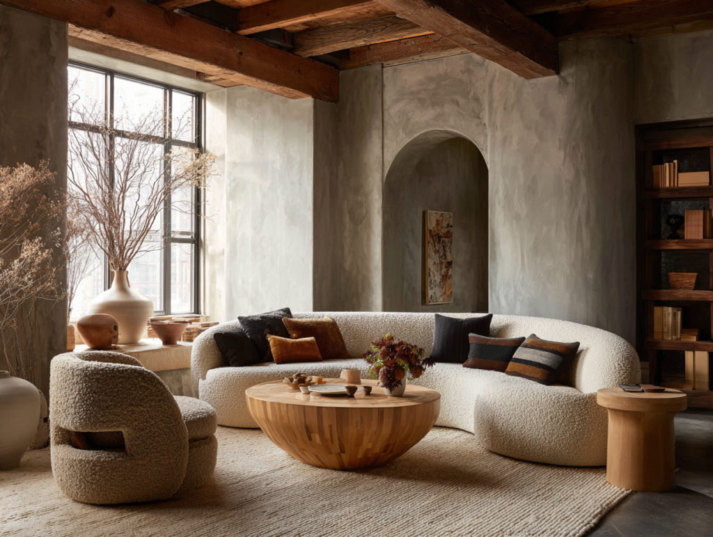 Curvilinear forms are the hallmark of Organic Modern seating. Sofas with rounded backs and arms, kidney-shaped chairs, and circular ottomans all introduce softness that contrasts beautifully with architectural straight lines. These pieces aren’t just aesthetically pleasing—research shows curved furniture enhances comfort by cradling the body and creates psychological safety through the absence of sharp edges.